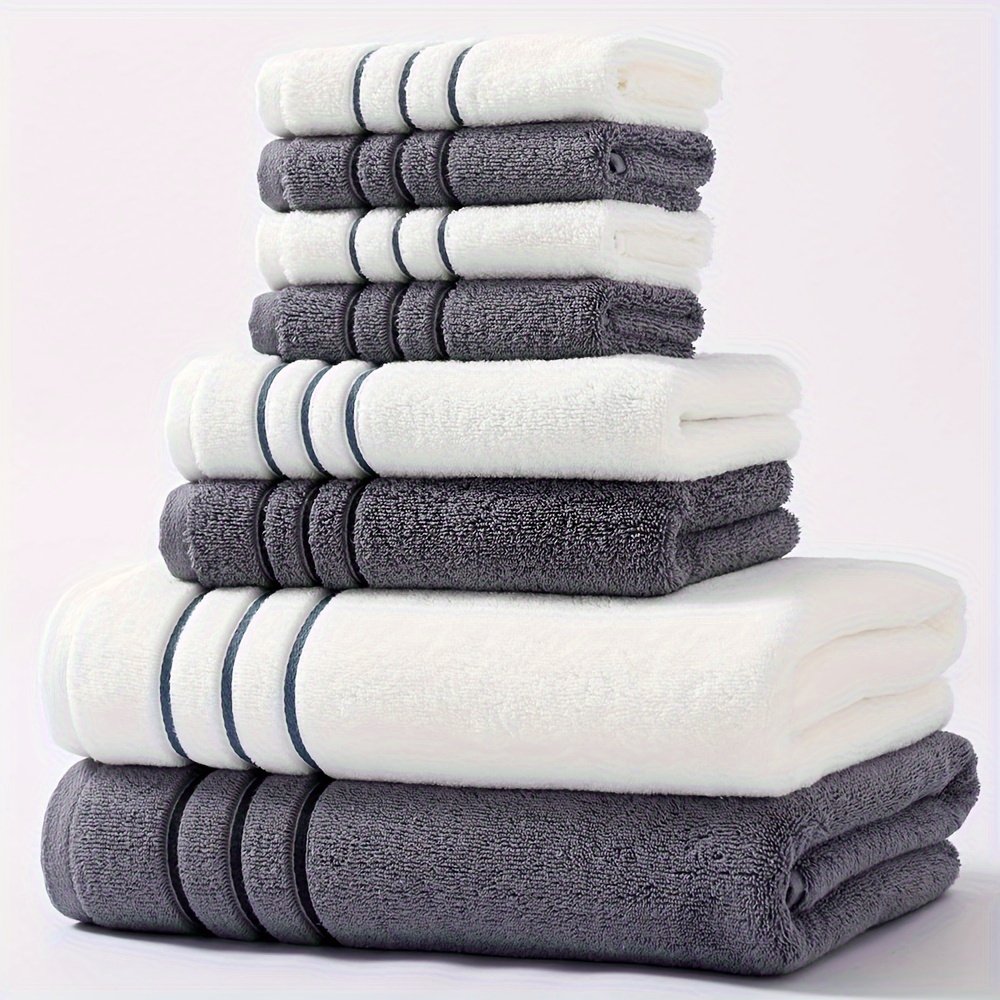 Conjunto de 8 Toalhas de Banho Listradas de Dois Tons, Padrão Hotel Cinco Estrelas, Superabsorventes e Ultramacias, Que Não Soltam Pelos, Incluindo 2 Toalhas de Banho Grandes, 2 Toalhas de Banho Grandes e 4 Toalhas de Rosto.