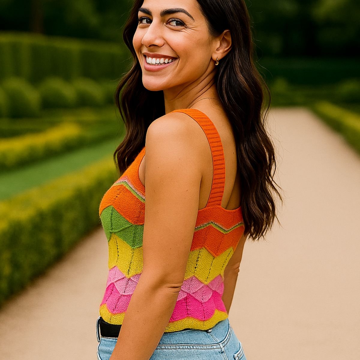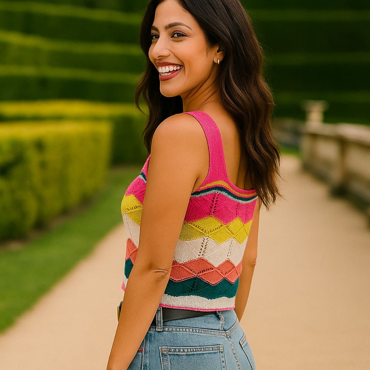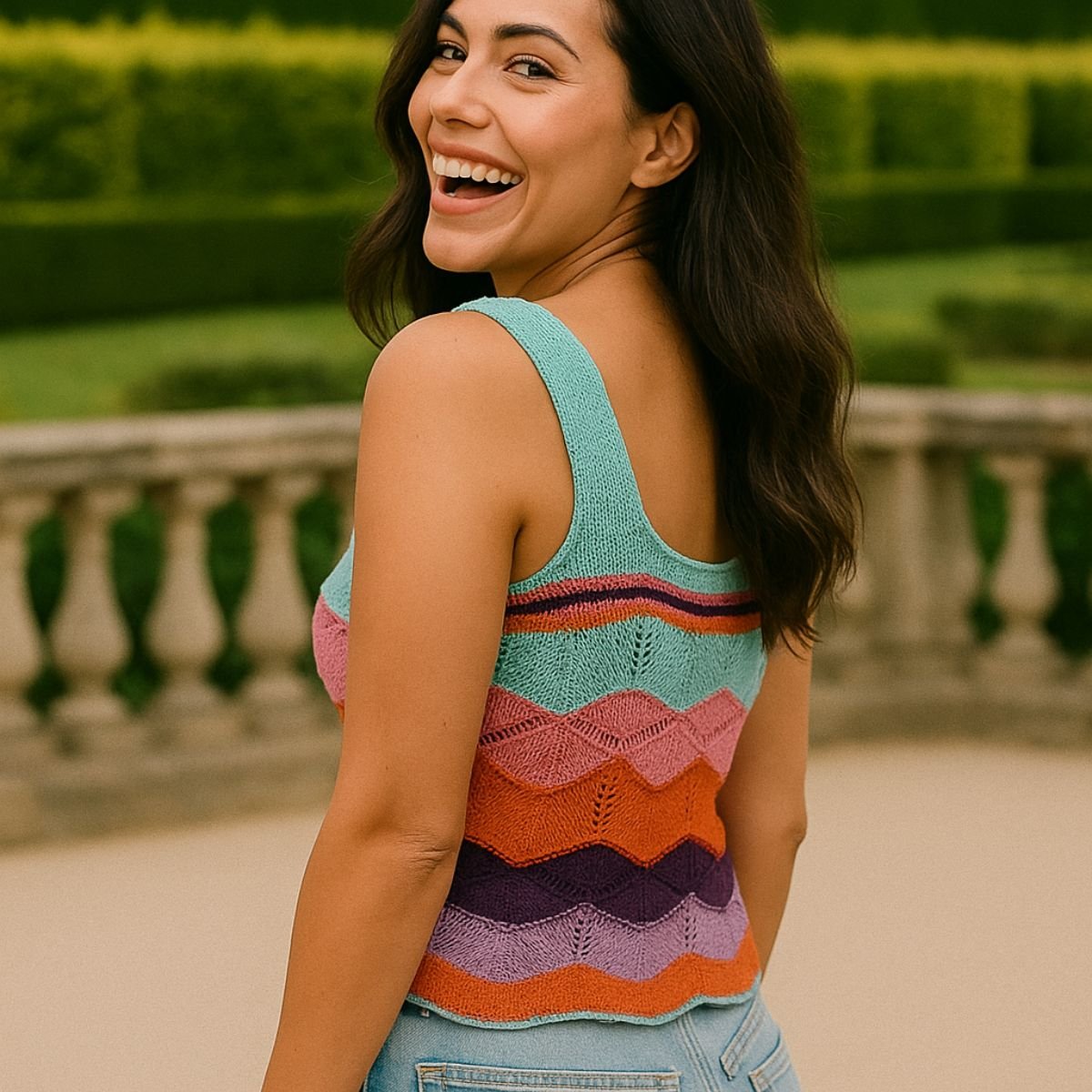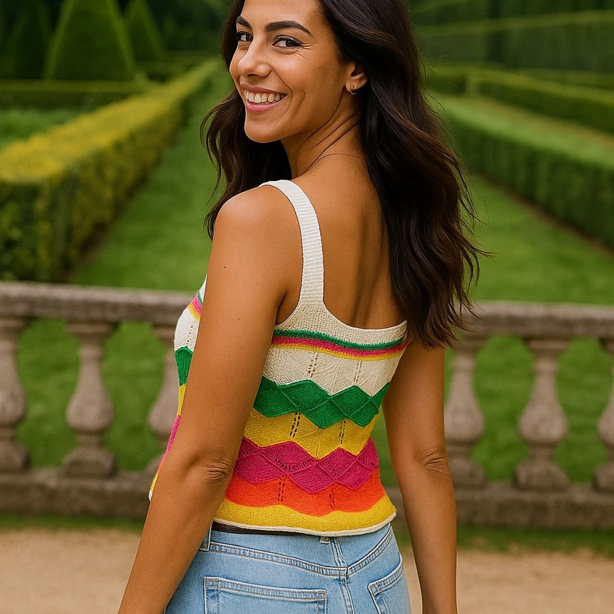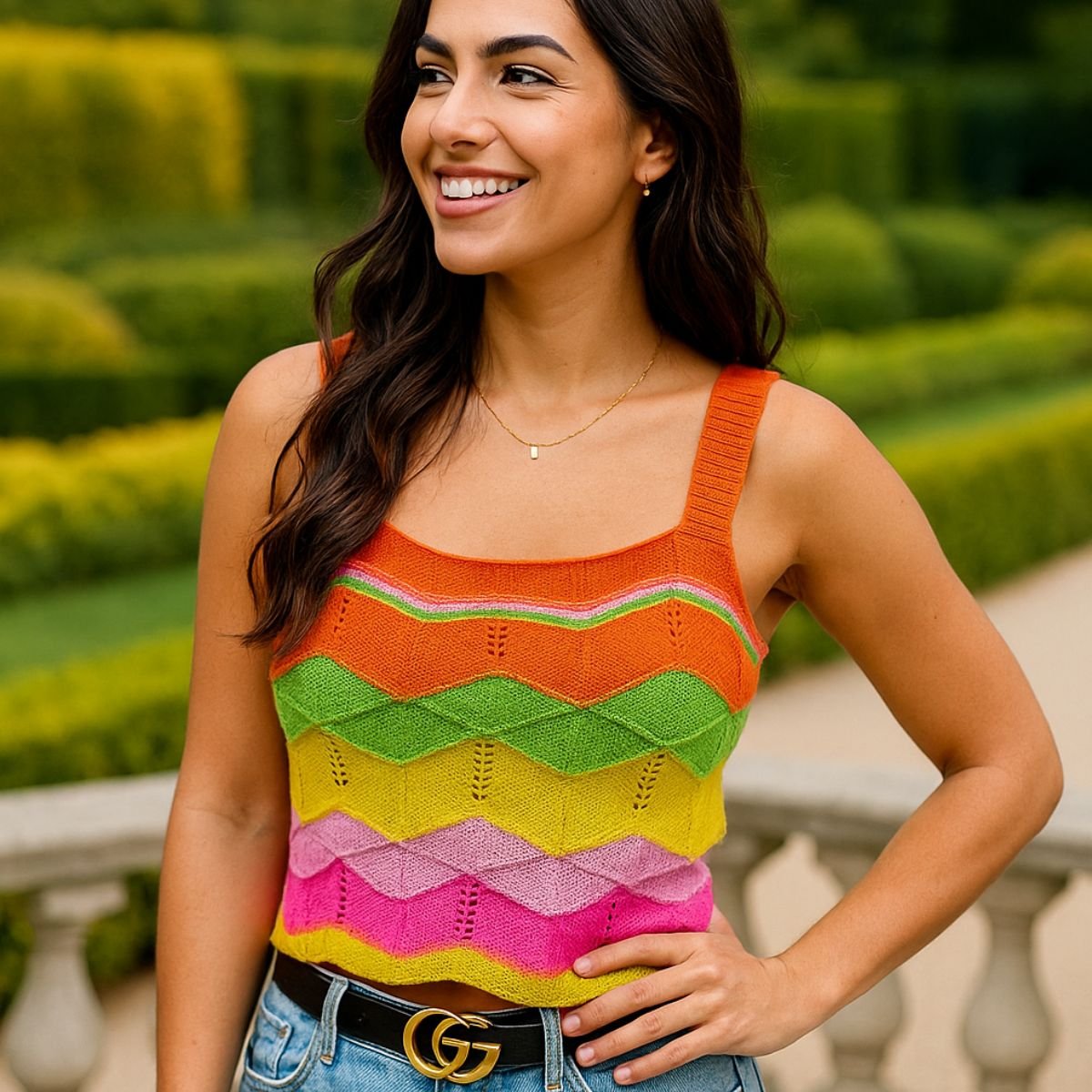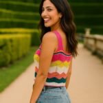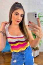 Com modelagem cropped e alças largas, valoriza o corpo com conforto e frescor, sendo ideal para os dias mais quentes ou composições em camadas. O design em ondas coloridas traz um toque alegre e moderno à peça.