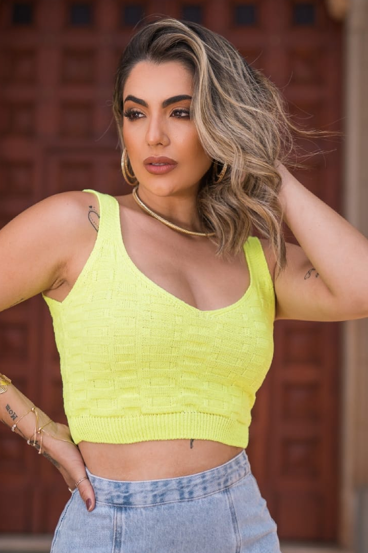 Cropped confeccionado em tricot. Possui detalhes tijolinho. Ótima opção para completar o look, uma peça chave, confortável, charmosa e leve. Ideal para dias mais quentes.