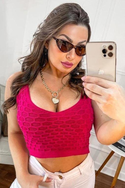 Cropped confeccionada em tricot modal. Possui decote V e tecido com relevo que lembra o quadriculado. Peça charmosa e perfeito para os dias mais quentes.
