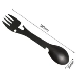Especificações Cor: Preto, Tira Elétrico: Não Função 1: Garfo Função 2: Colher Função 3: Abridor de Garrafas Função 4: Abridor de Latas Material: Aço Inoxidável Nome: Garfo Multifuncional Tamanho: 35*180mm Tipo: Multiferramentas de Bolso Peso: 55g