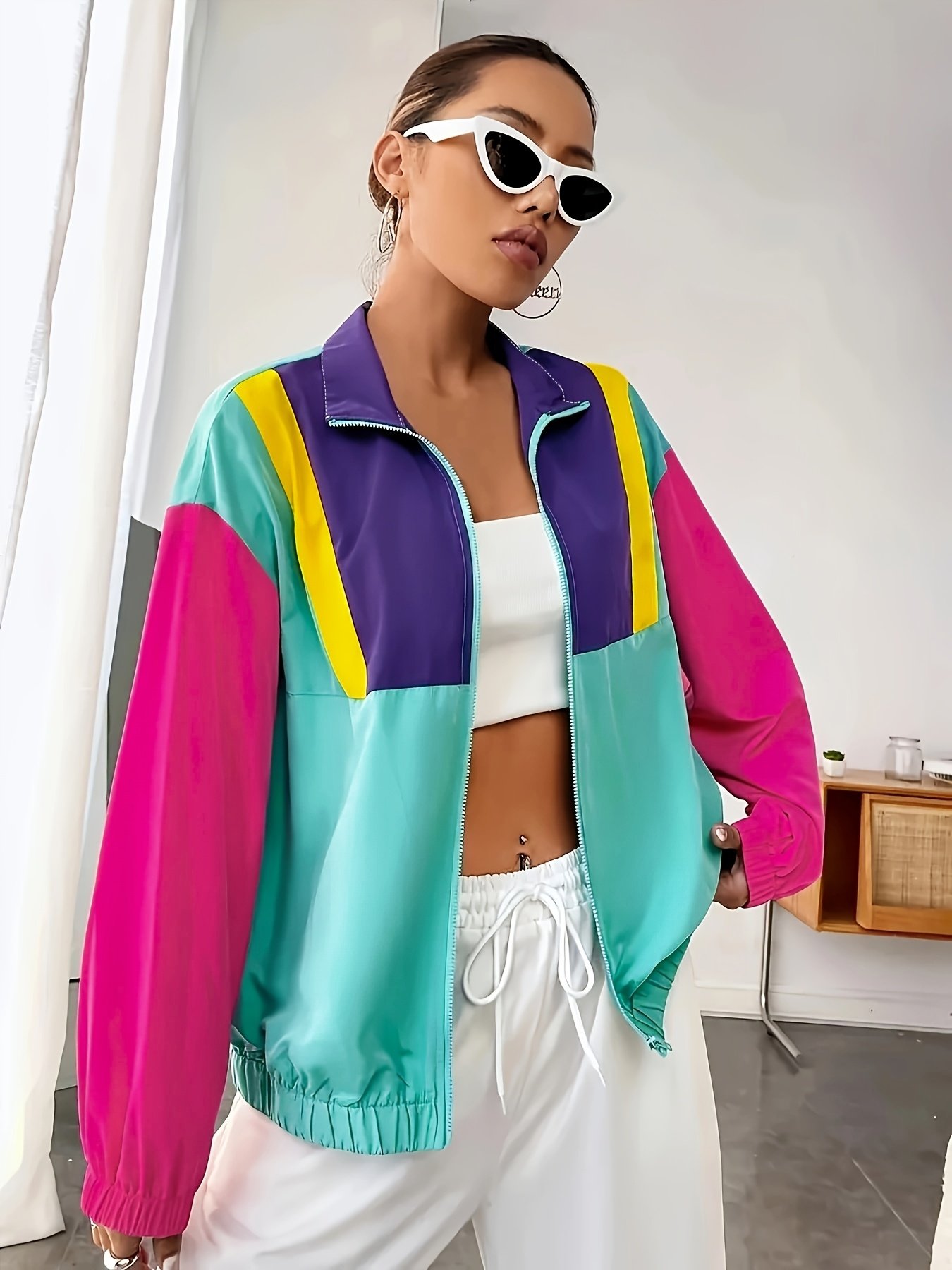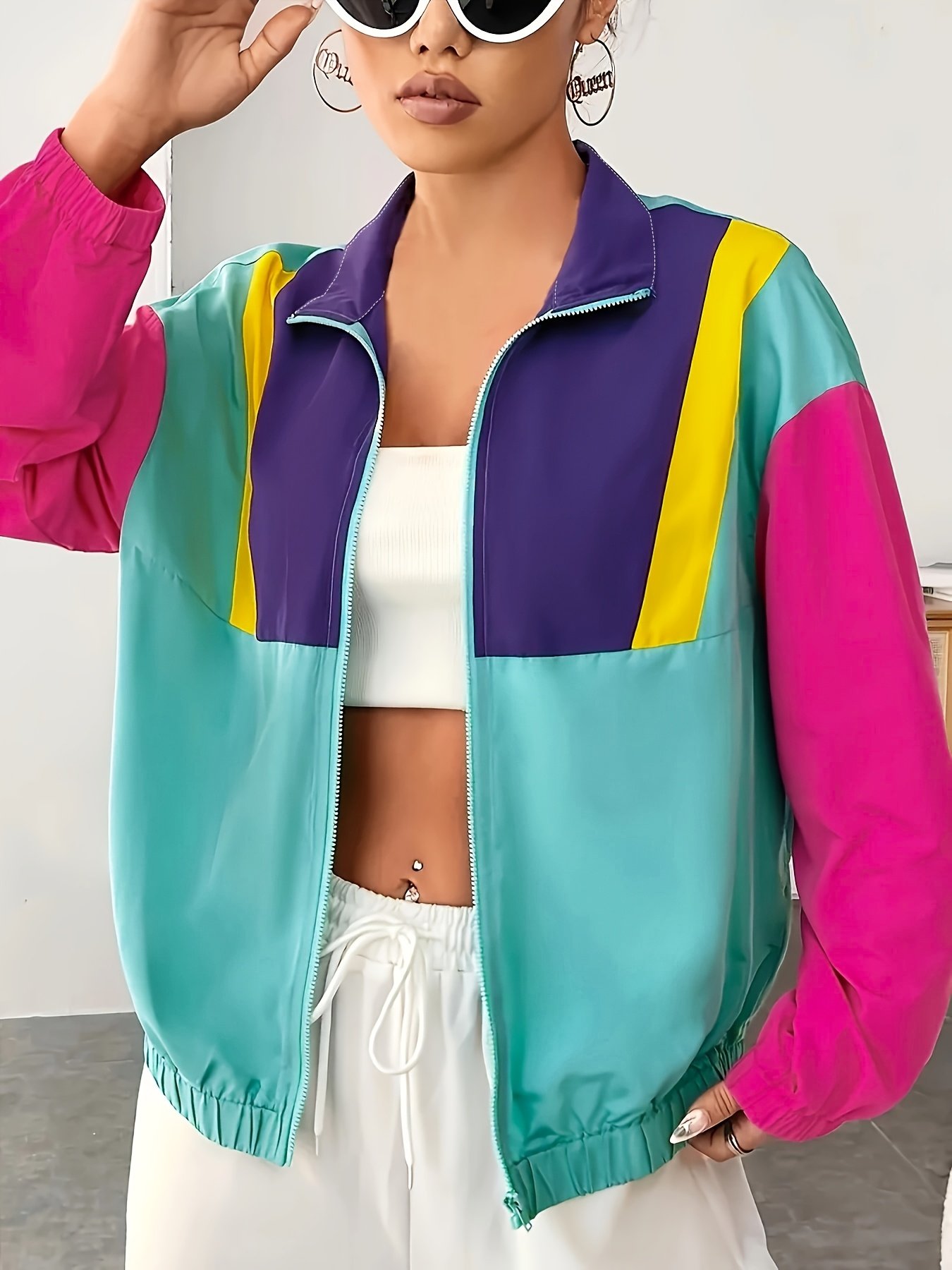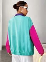 Jaqueta Feminina Casual Plus Size Com Zíper e Blocos de Cores – Design Contrastante e Ousado Com Detalhes Em Turquesa, Roxo, Amarelo e Rosa, Agasalho Leve para Primavera / Outono, Lavável à Mão, Peça para Usar Em Camadas no Outono, Acabamento Liso e Brilhante.