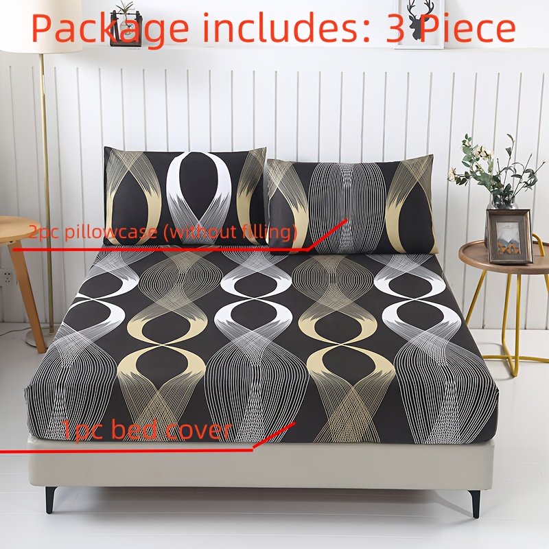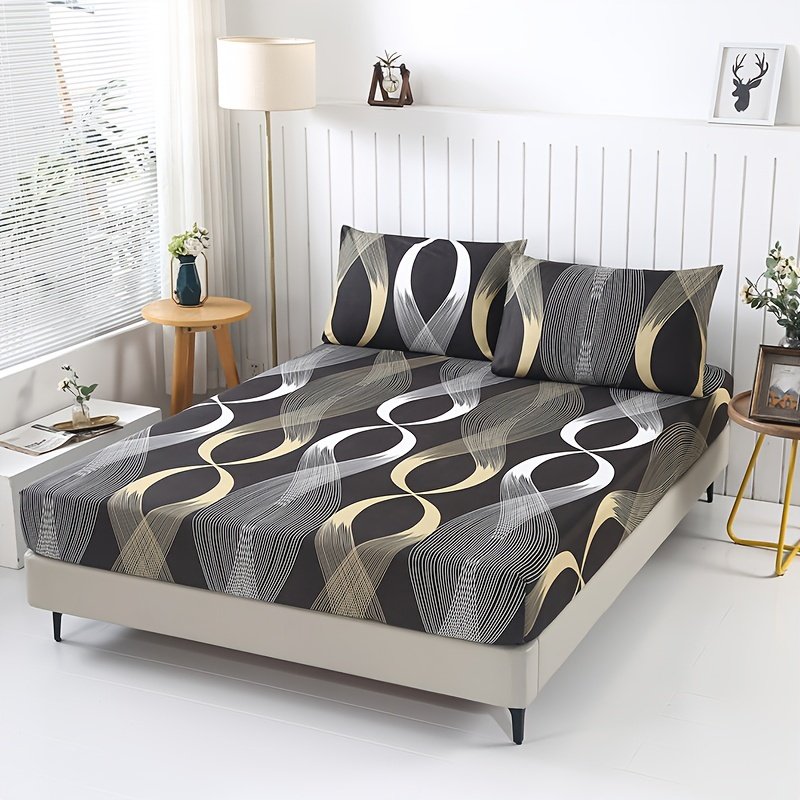 Conjunto de 3 Peças de Roupa de Cama Com Estampa Listrada e Estampada Em Torre, Protetor de Colchão, Lençol para Cama de Solteiro, Cama de Casal, Tamanho Grande para Quarto, Quarto de Hóspedes (um Lençol Com Elástico + Duas Fronhas, Sem Miolo).