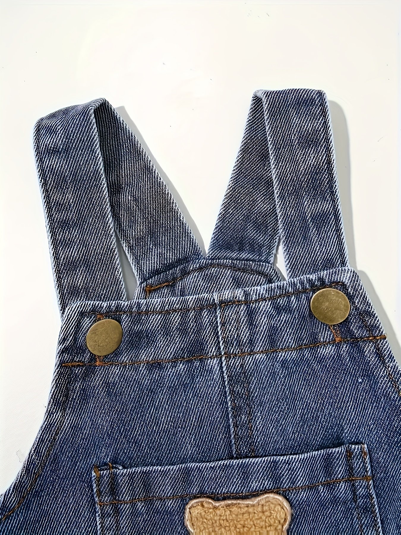 Macacão Jeans Azul Festivo para Meninos Com Adorável Estampa de Urso, Estilo Casual Outono / Inverno, Perfeito para Brincadeiras Ao Ar Livre, Design Com Estampa de Urso, Tecido Não Elástico, Caimento Regular, Bolsos Incluídos, Perfeito para Atividades Ao Ar Livre.