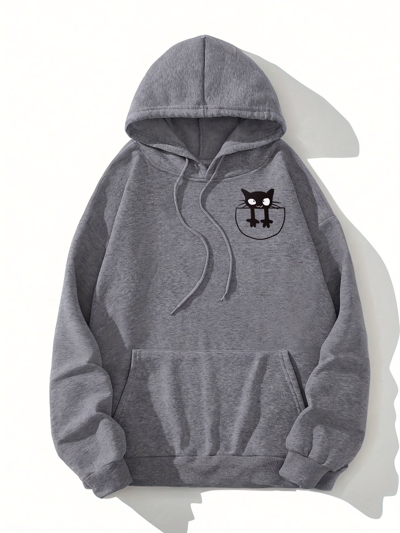 Moletom Cinza Estiloso Com Estampa de Gato Adorável, Suéter Casual de Inverno Feminino, Elasticidade Média, Lavagem à Mão ou a Seco, Perfeito para Trajes Casuais, Moletom Aconchegante | Moletom Com Capuz | Ajuste Confortável, Moletom Com Capuz.