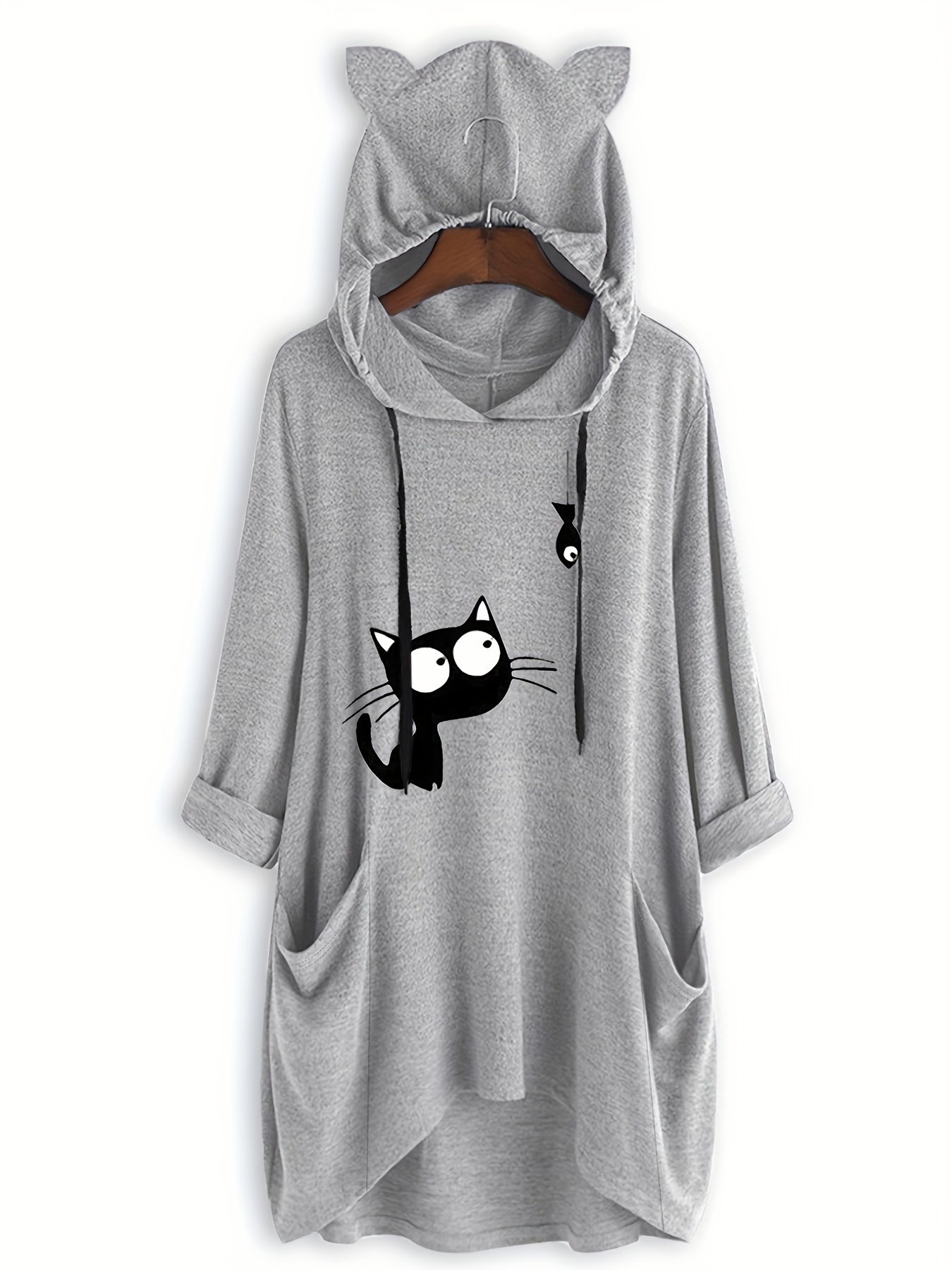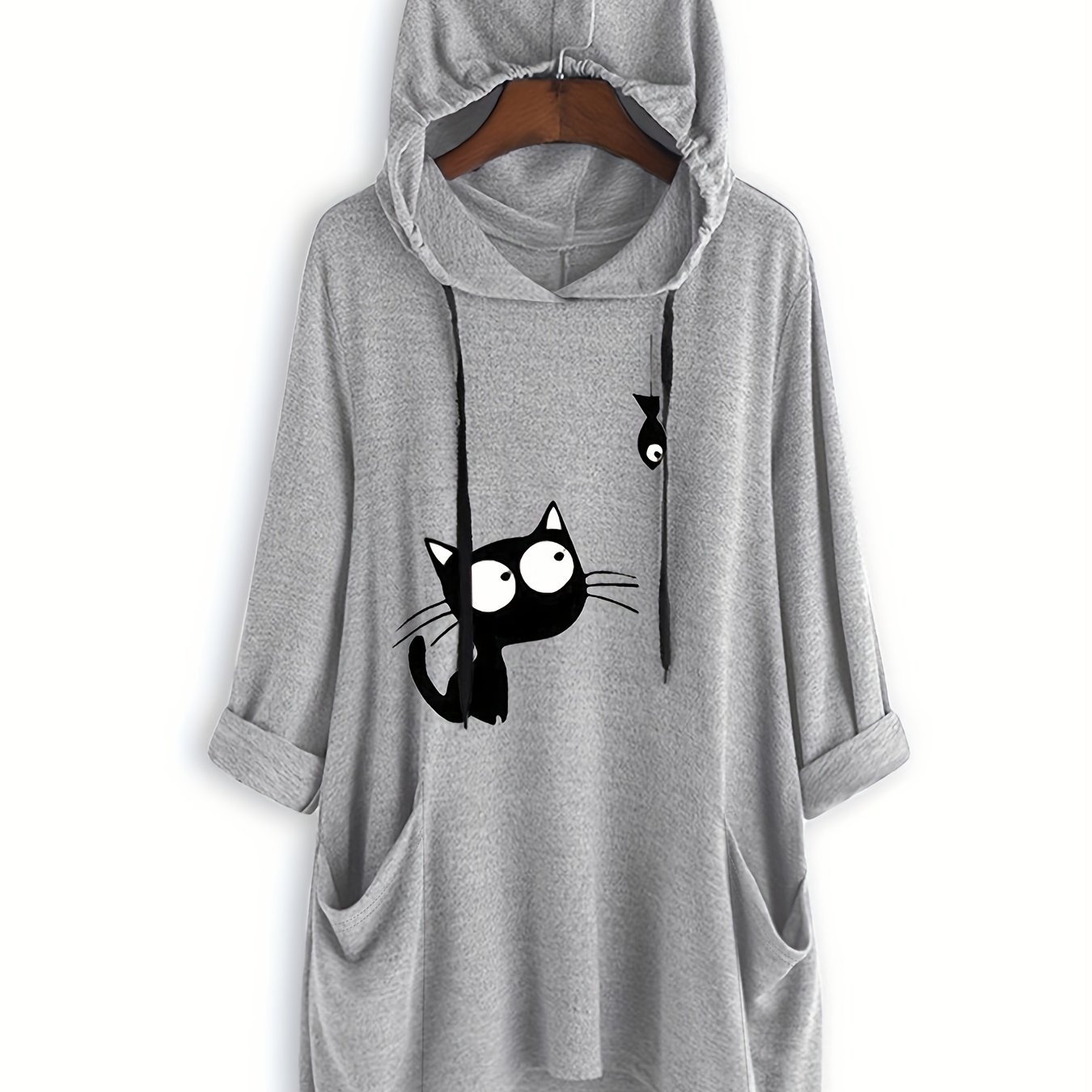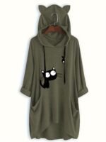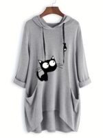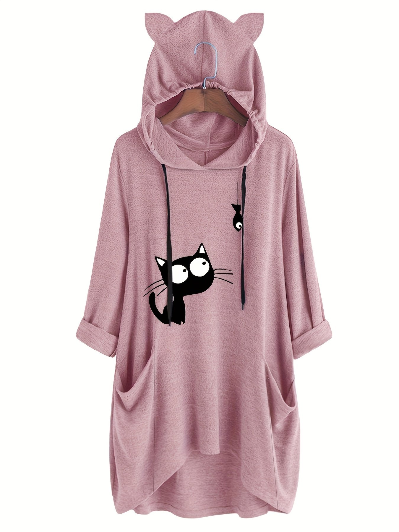Moletom Feminino Casual Com Capuz e Estampa de Gato Preto – Pulôver Rosa Suave e Aconchegante, Capuz Com Cordão Ajustável, Manga, Moda Outono, Lavável à Máquina, Suéter Com Capuz, Vestuário de Outono, Roupa Confortável.