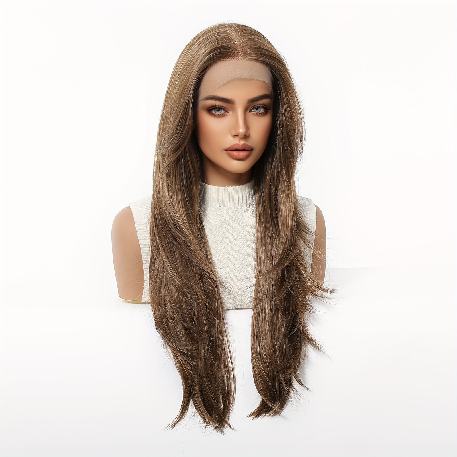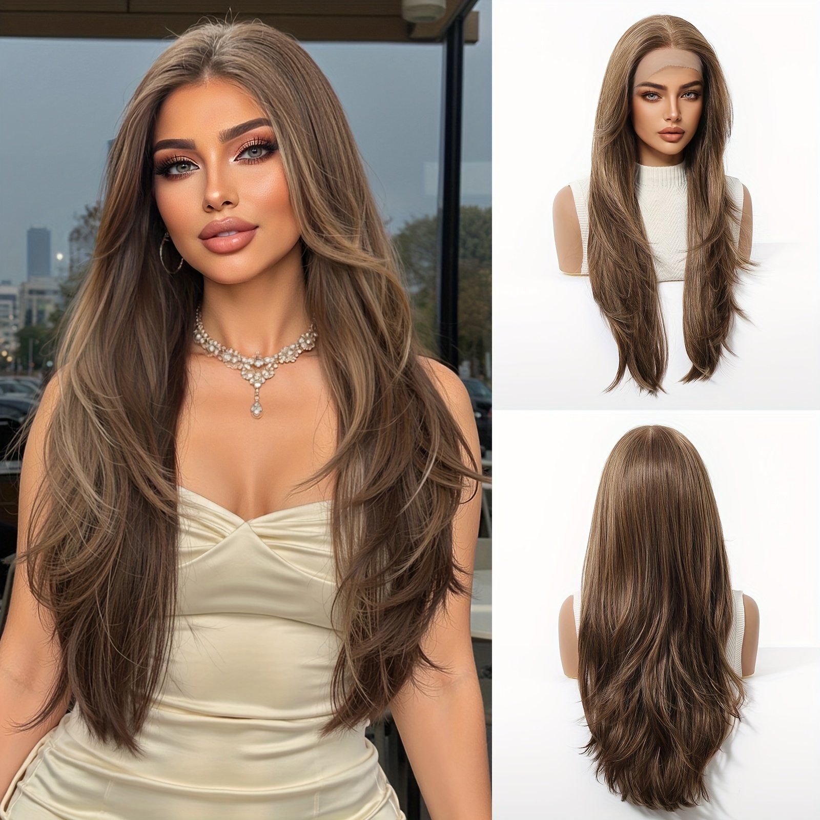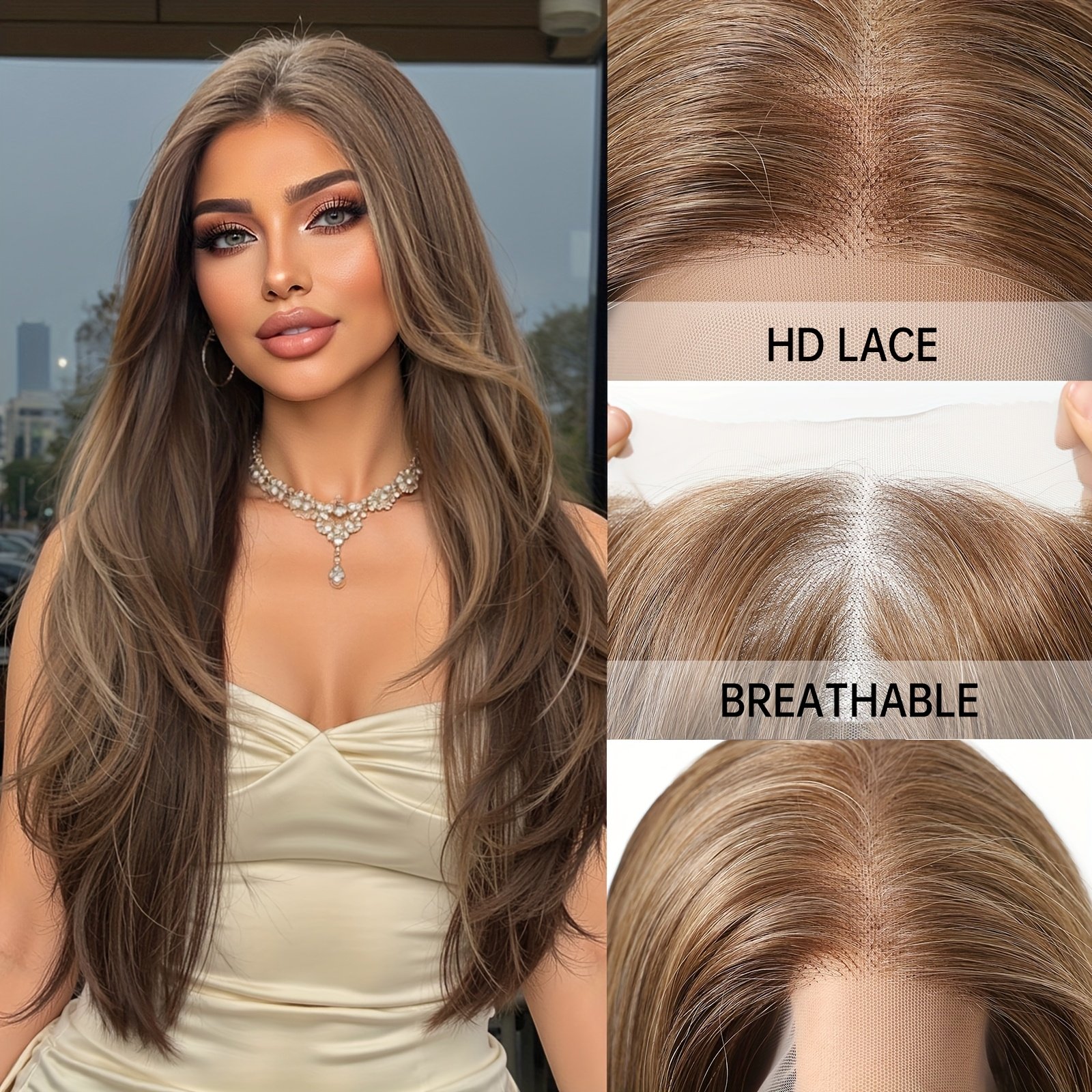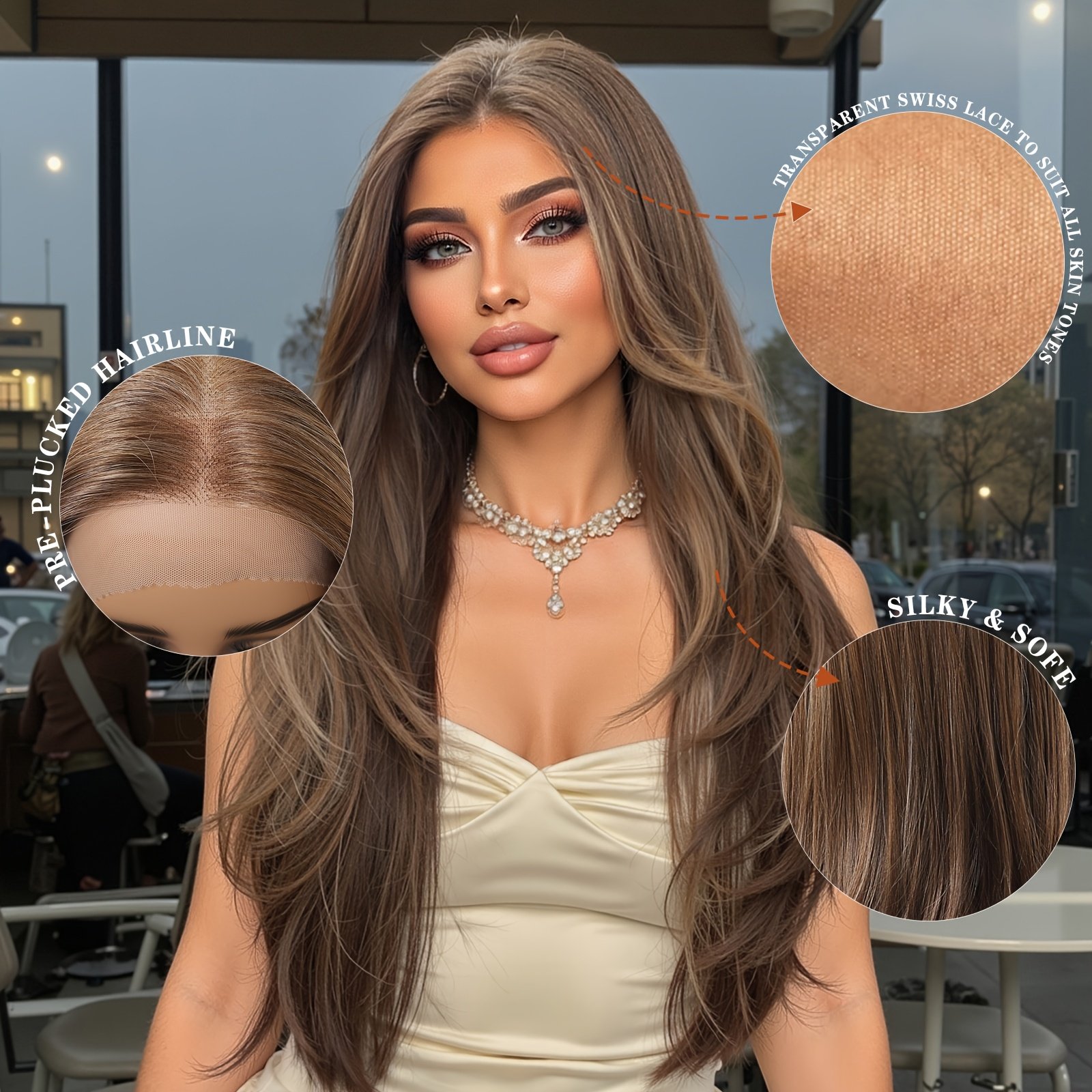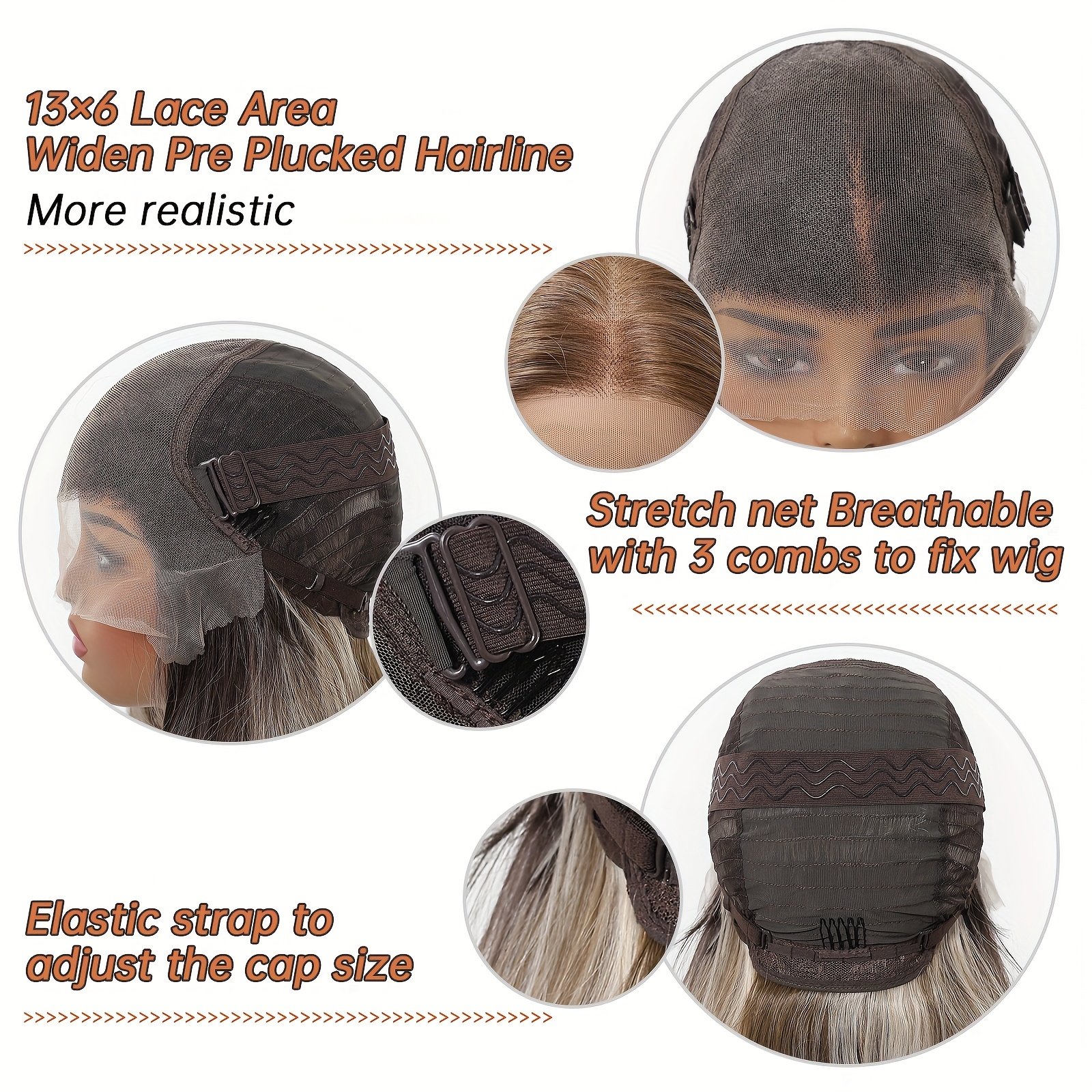 Peruca Frontal de Renda Transparente Hd 13x6, 66,04 Cm, Cor Marrom Com Mechas, Cabelo Liso, Peruca de Renda Sintética, Sem Cola, Com Linha Capilar Natural Pré-depilada, Uso Diário para Festas, Aparência Natural e Ajuste Confortável, Estilo Elegante e Versátil para Mulheres.