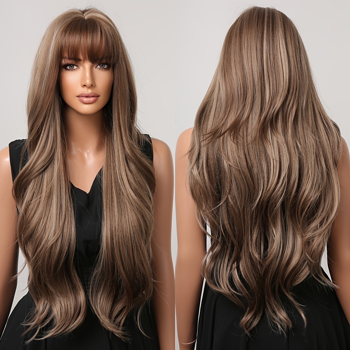 Perucas de Cabelo Longo Ondulado e Cacheado Com Corte Borboleta de 71,12 Cm Com Franja para Mulheres, Perucas de Substituição de Cabelo de Fibra Sintética para Uso Diário Em Festas.
