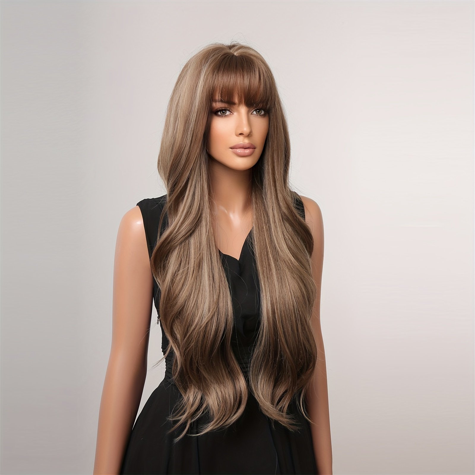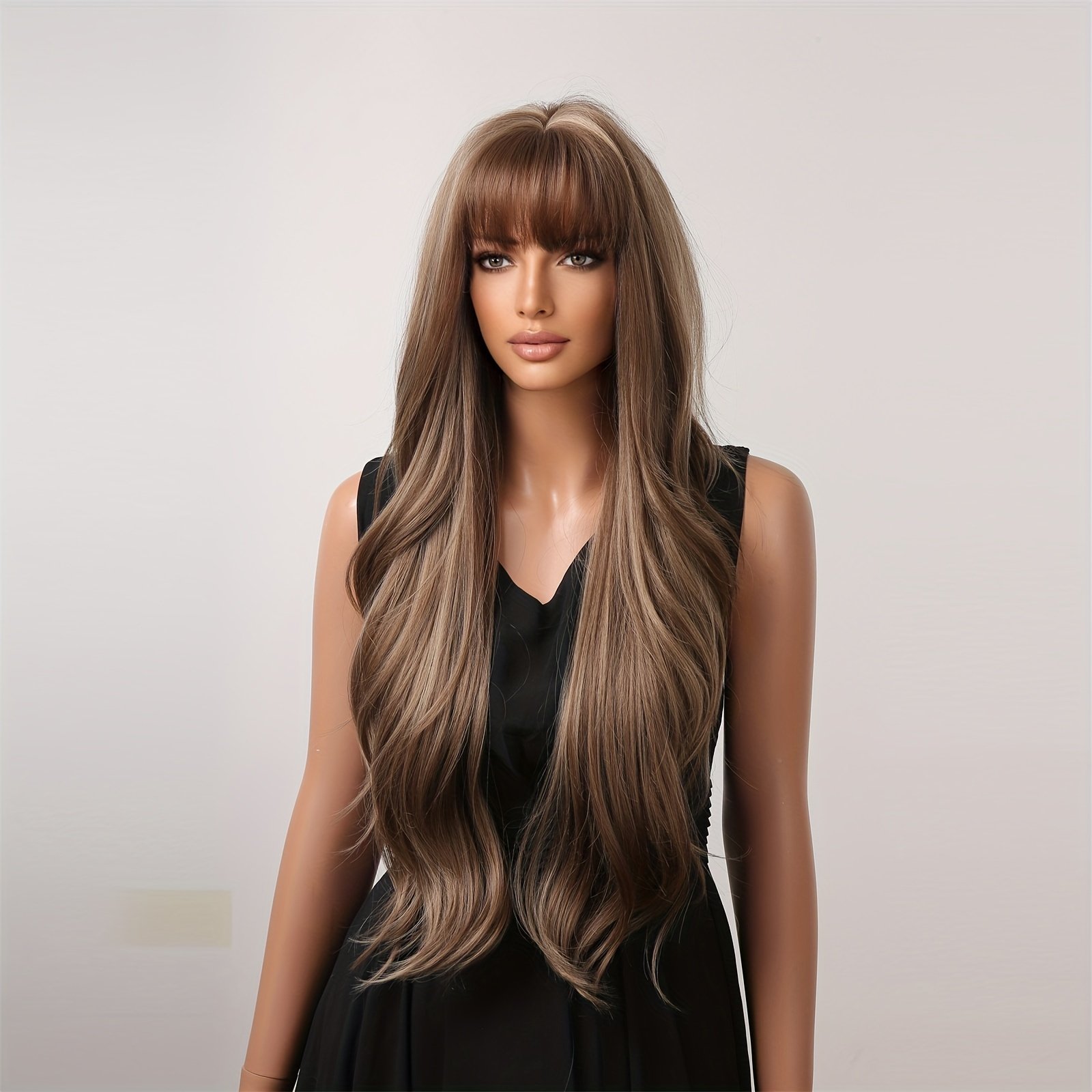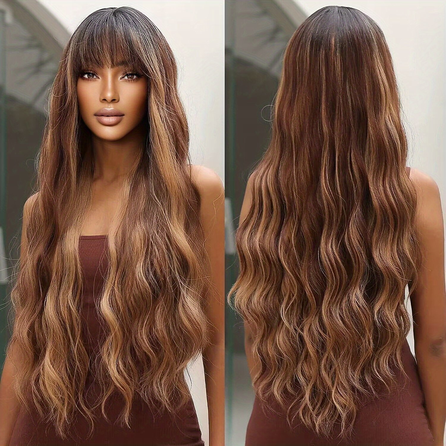 Perucas de Cabelo Longo Ondulado e Cacheado Com Corte Borboleta de 71,12 Cm Com Franja para Mulheres, Perucas de Substituição de Cabelo de Fibra Sintética para Uso Diário Em Festas.