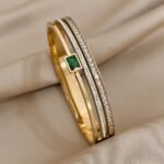 Pulseira de Luxo Em Aço Inoxidável, para Homens e Mulheres, Dourada e à Prova D’água, Com Strass Verde e Branco.