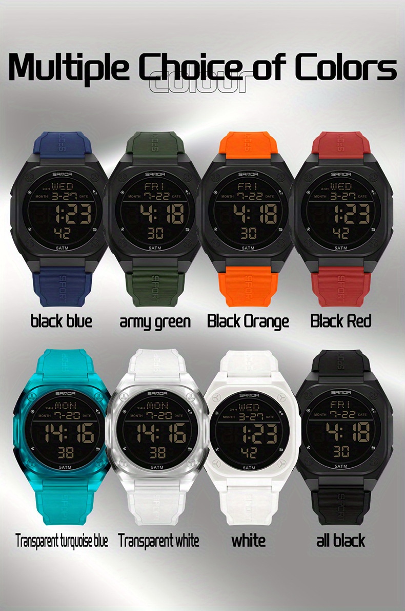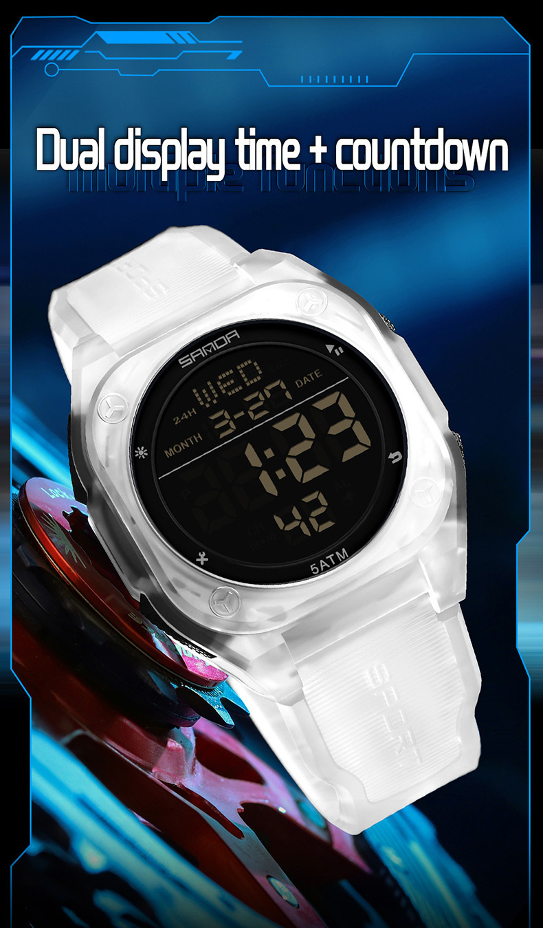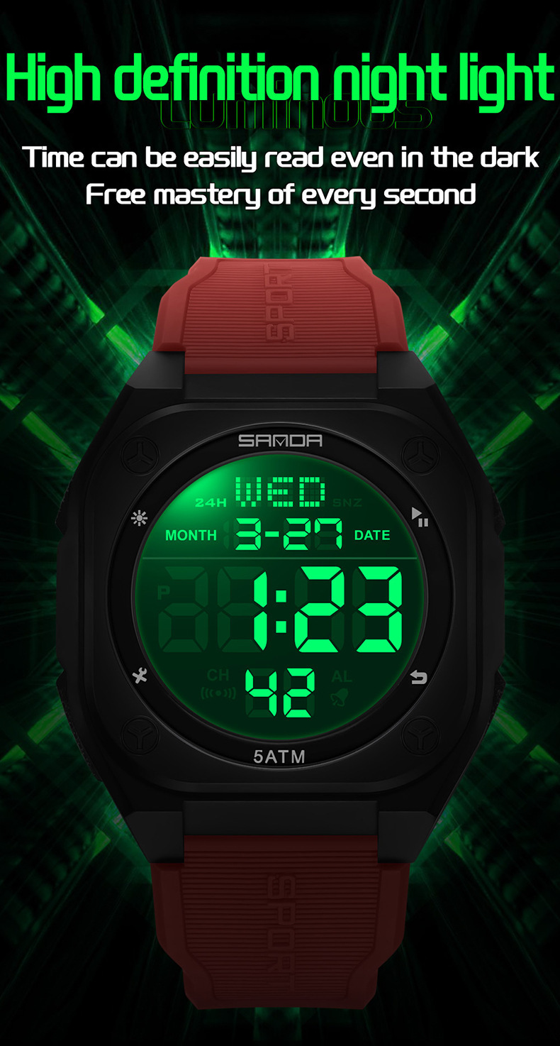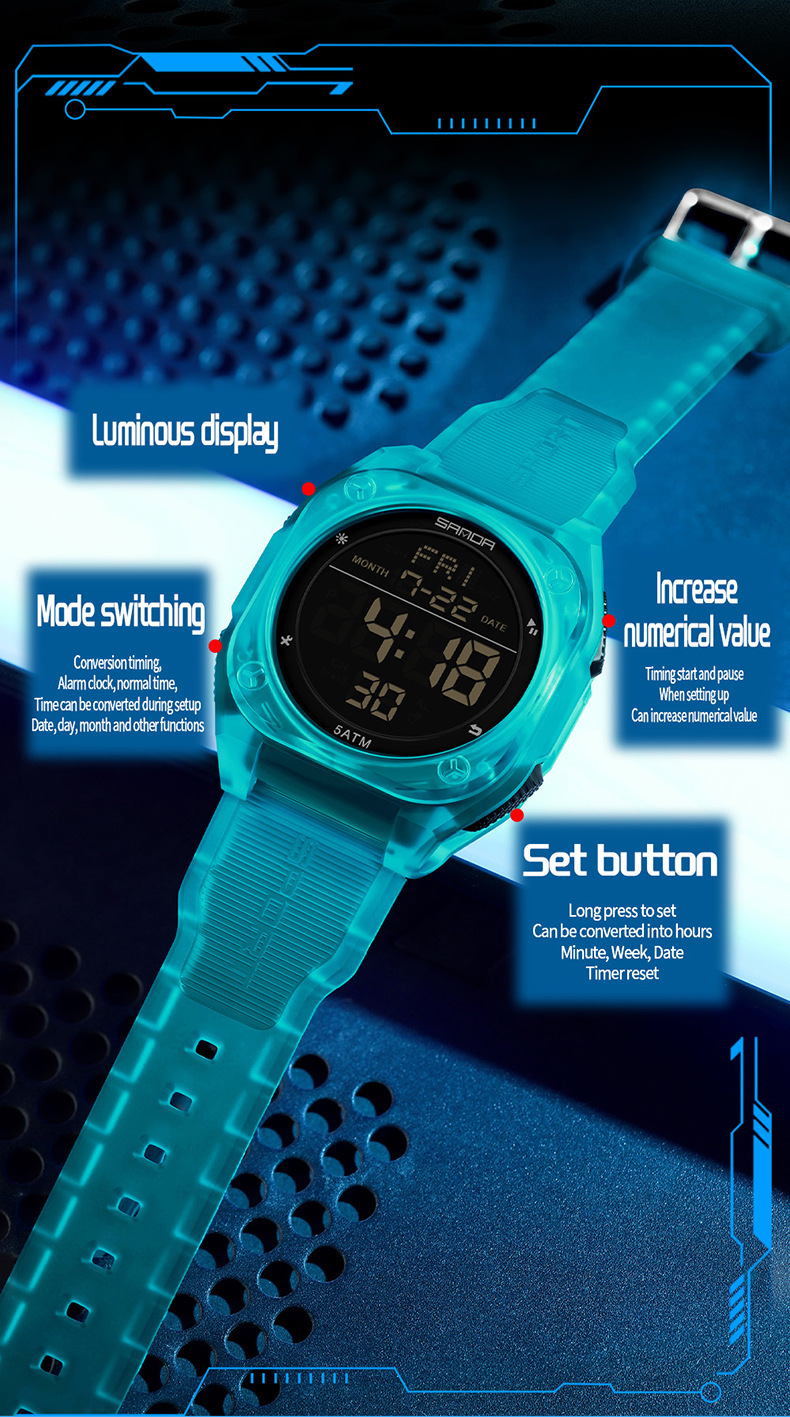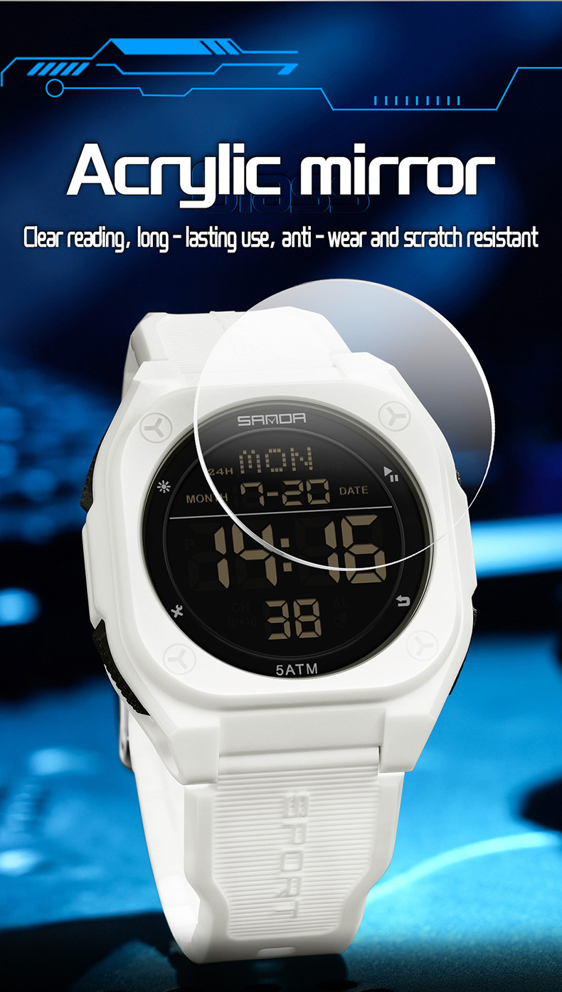 Especificações: Propriedades da Bateria: Bateria Não Recarregável Marca: Sanda Formato do Mostrador: Redondo Tipo de Visor: Digital Modo de Funcionamento: Eletrônico Funções: Data; Cronômetro; Despertador Mecanismo: Relógio Digital Bateria Não Recarregável: Bateria Tipo Botão (diâmetro < 20 Mm) Tensão de Operação: ≤ 36 v Modo de Alimentação: Alimentado por Bateria Material da Pulseira: TPU Estilo: Esportivo Material da Caixa do Relógio: Resina Sintética Nível de Resistência à Água: 50 m Instruções de Uso: Outras