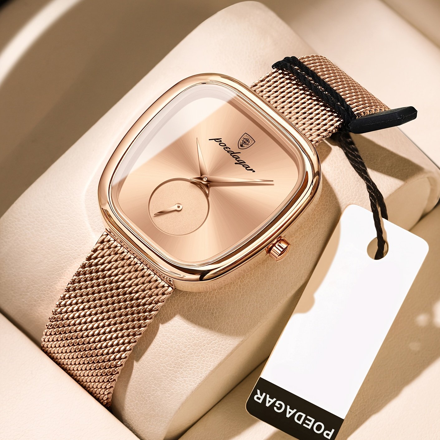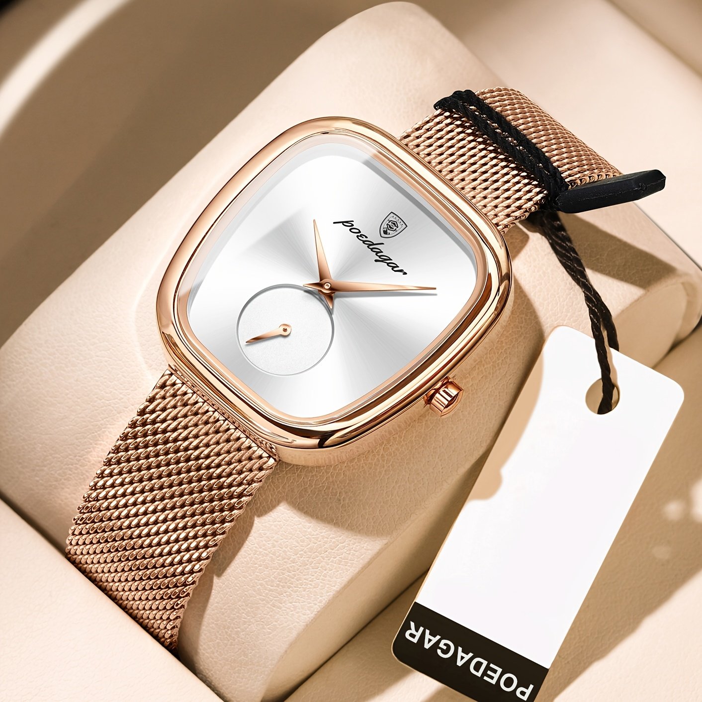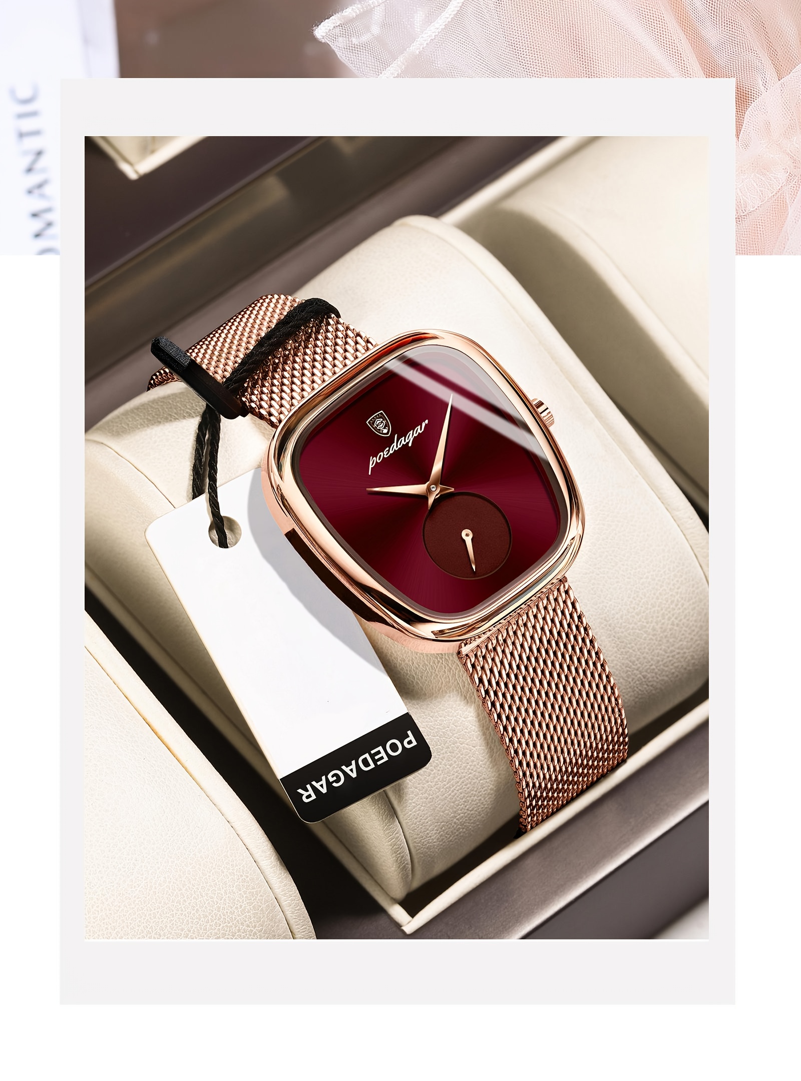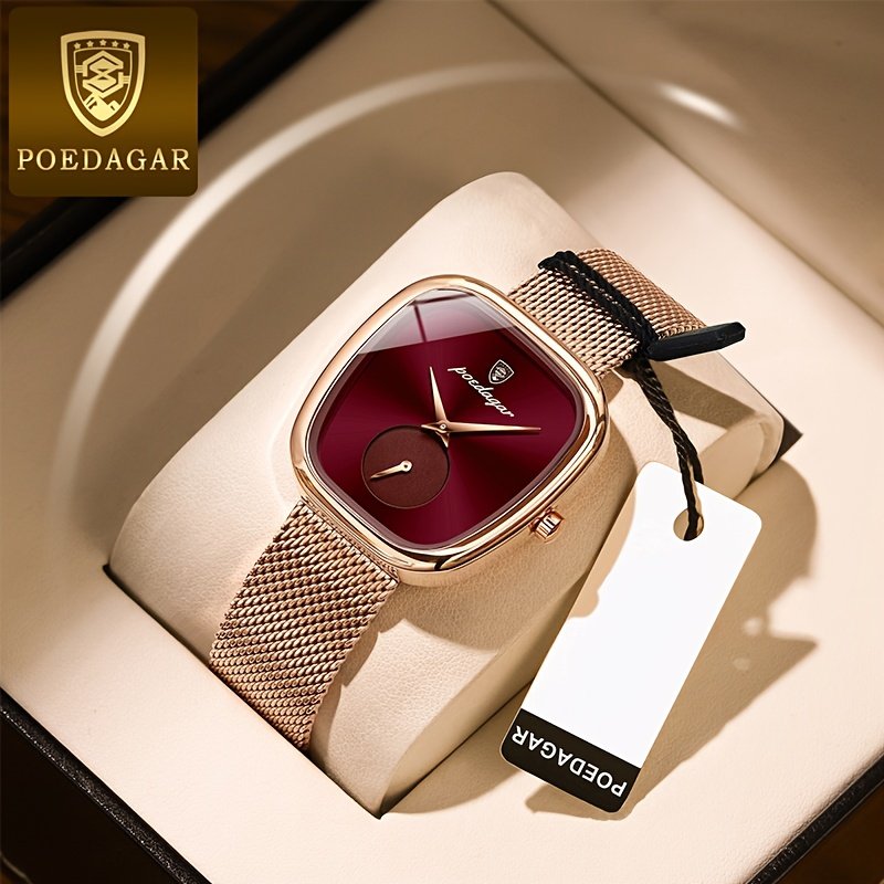 Especificações: Faixa Etária Recomendada: Acima de 15 Anos Características da Bateria: Bateria Não Recarregável Marca: Poedagar Cor: Dourado Rosê Método de Conexão: Nenhum Formato do Mostrador: Quadrado Tipo de Exibição: Ponteiro Modo de Funcionamento: Eletrônico Pureza do Material: Não é Metal Precioso Movimento: Relógios de Quartzo Bateria Não Recarregável: Bateria de Botão (Diâmetro < 20 Mm) Tensão de Operação: ≤ 36 v Modo de Alimentação: Alimentado por Bateria Material da Pulseira: Aço Inoxidável Estilo: Elegante Material da Caixa do Relógio: Liga Metálica Nível de Resistência à Água: 30 m