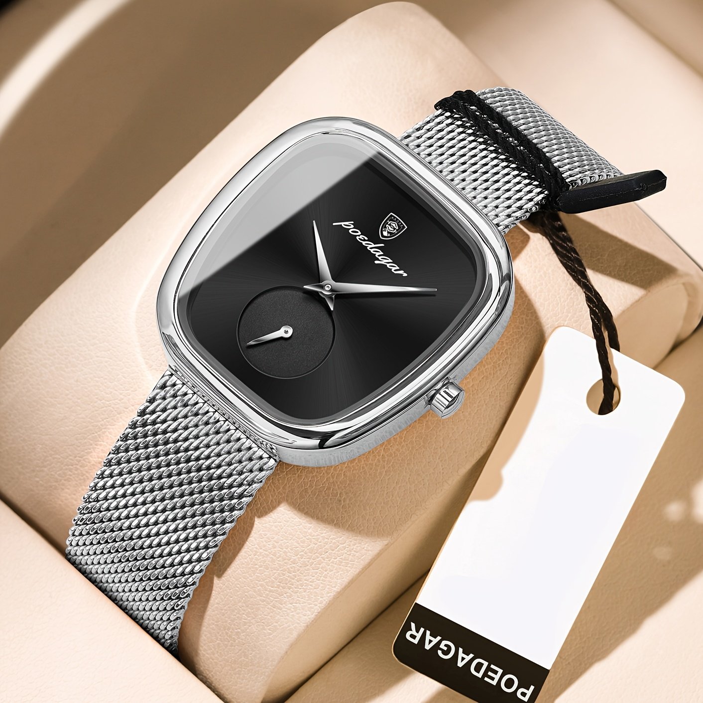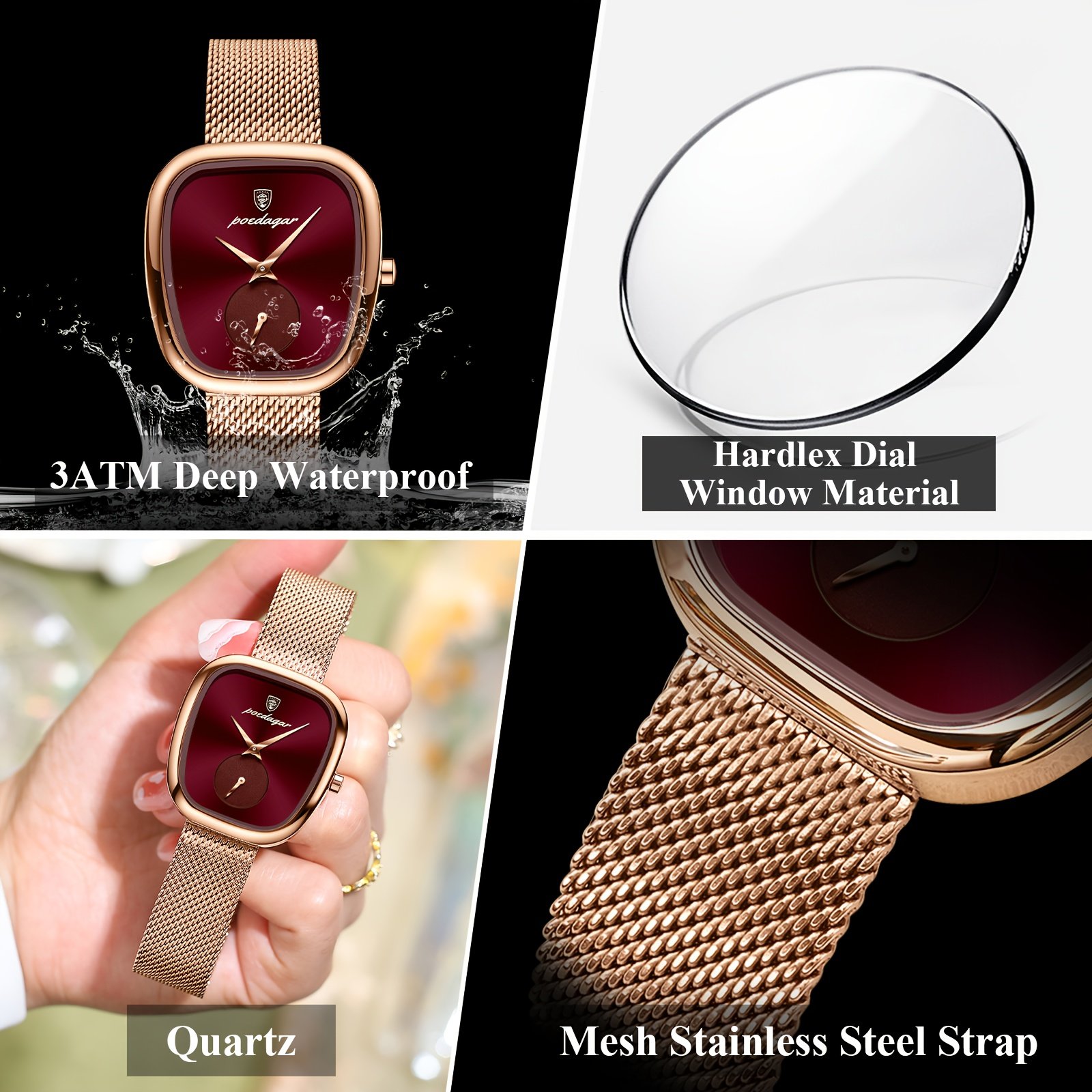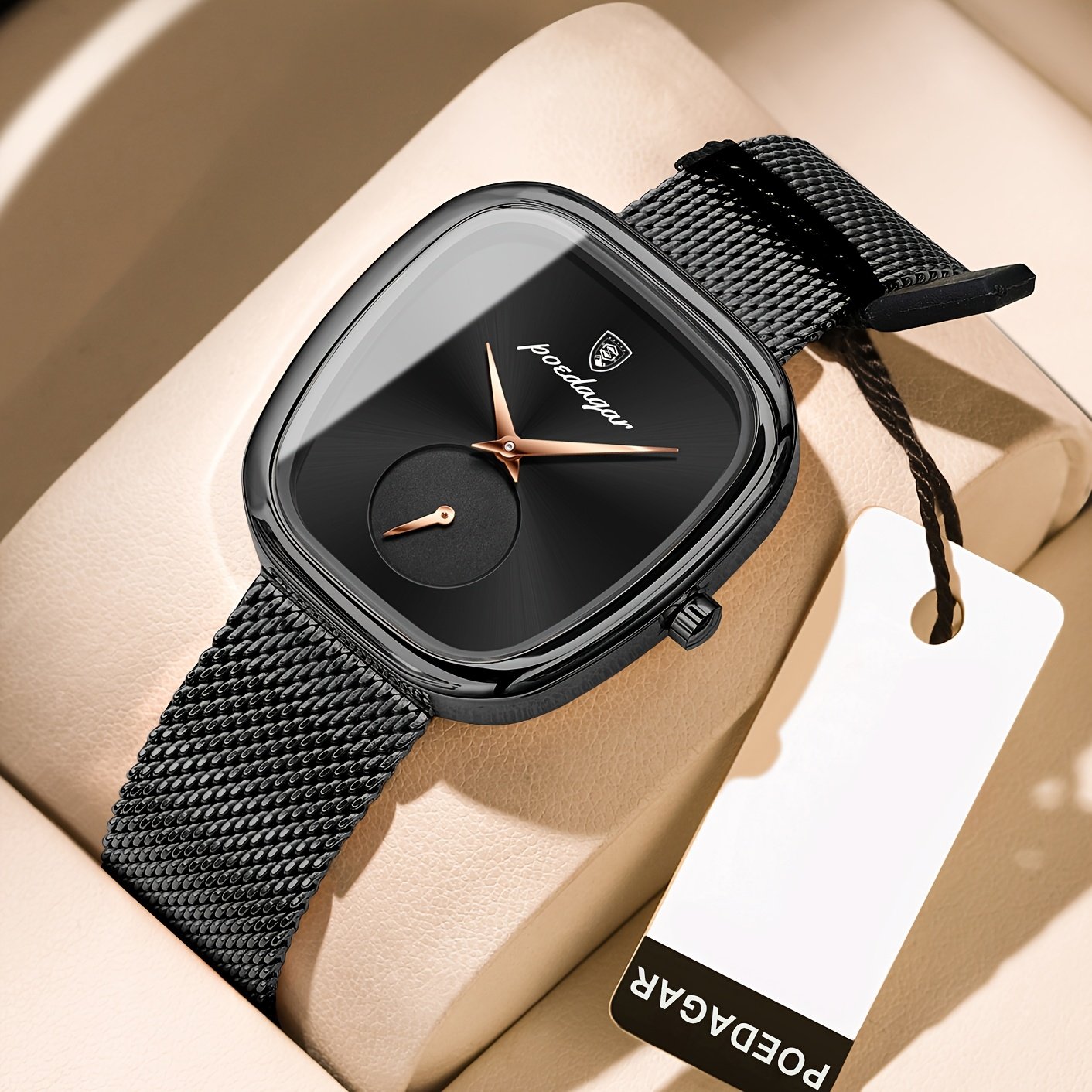 Especificações: Faixa Etária Recomendada: Acima de 15 Anos Características da Bateria: Bateria Não Recarregável Marca: Poedagar Cor: Dourado Rosê Método de Conexão: Nenhum Formato do Mostrador: Quadrado Tipo de Exibição: Ponteiro Modo de Funcionamento: Eletrônico Pureza do Material: Não é Metal Precioso Movimento: Relógios de Quartzo Bateria Não Recarregável: Bateria de Botão (Diâmetro < 20 Mm) Tensão de Operação: ≤ 36 v Modo de Alimentação: Alimentado por Bateria Material da Pulseira: Aço Inoxidável Estilo: Elegante Material da Caixa do Relógio: Liga Metálica Nível de Resistência à Água: 30 m