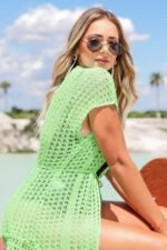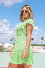Saída de praia Curta feminina. Confeccionado em tricot vazado, mangas babado. Casual e confortável.