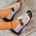 Sapatos Femininos Casuais de Quatro Estações, Festa, Bege, Bloco de Cores, Retrô, Respirável, Oco, Confortável, Elegante, Macio, Baixo.