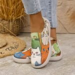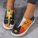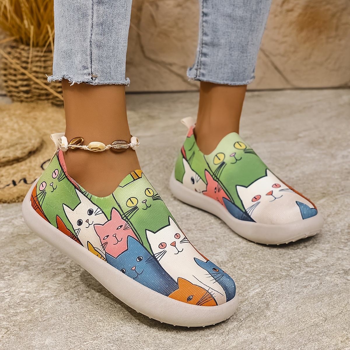 Sapatos Femininos Sem Cadarço de Malha - Design de Gato Colorido, Bico Redondo, Cabedal Em Tecido Leve e Respirável, Sola de Borracha, Perfeitos para Uso Casual, Slip-ons Casuais | Sapatos Com Solado Vibrante | Sapatos Com Sola de Borracha.
