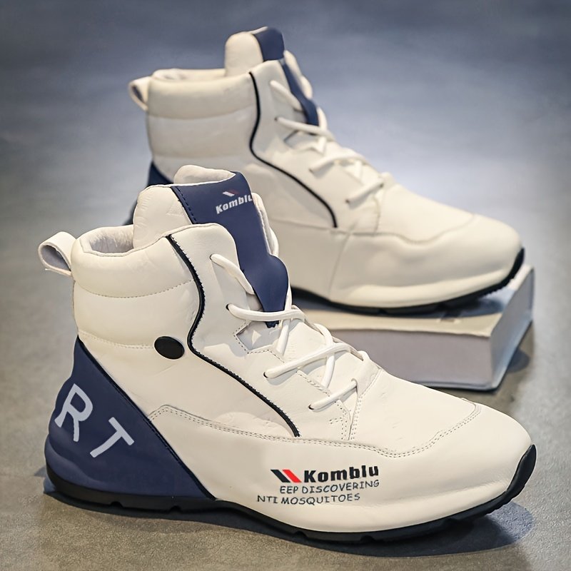 Tênis Casual Masculino de Cano Alto – Branco e Azul, Conforto para Todas as Estações, Tênis Com Cadarço e Sola de PVC Antiderrapante, Bico Redondo, Cabedal Em PU / Tecido, Perfeito para Uso Casual, Tênis de Cano Alto.