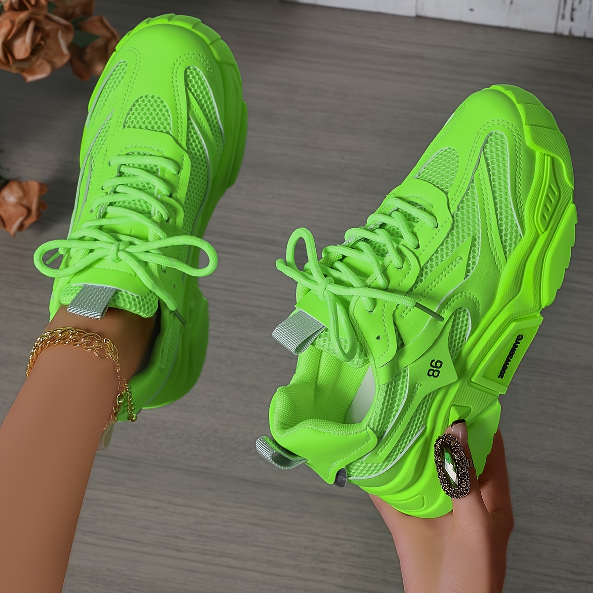 Tênis Feminino Verde Neon Respirável, Confortável, Antiderrapante, Com Fecho de Cadarço, Design Estiloso Com Bico Redondo, Calçado para Todas as Estações, Calçado Esportivo e  Sola de Borracha.