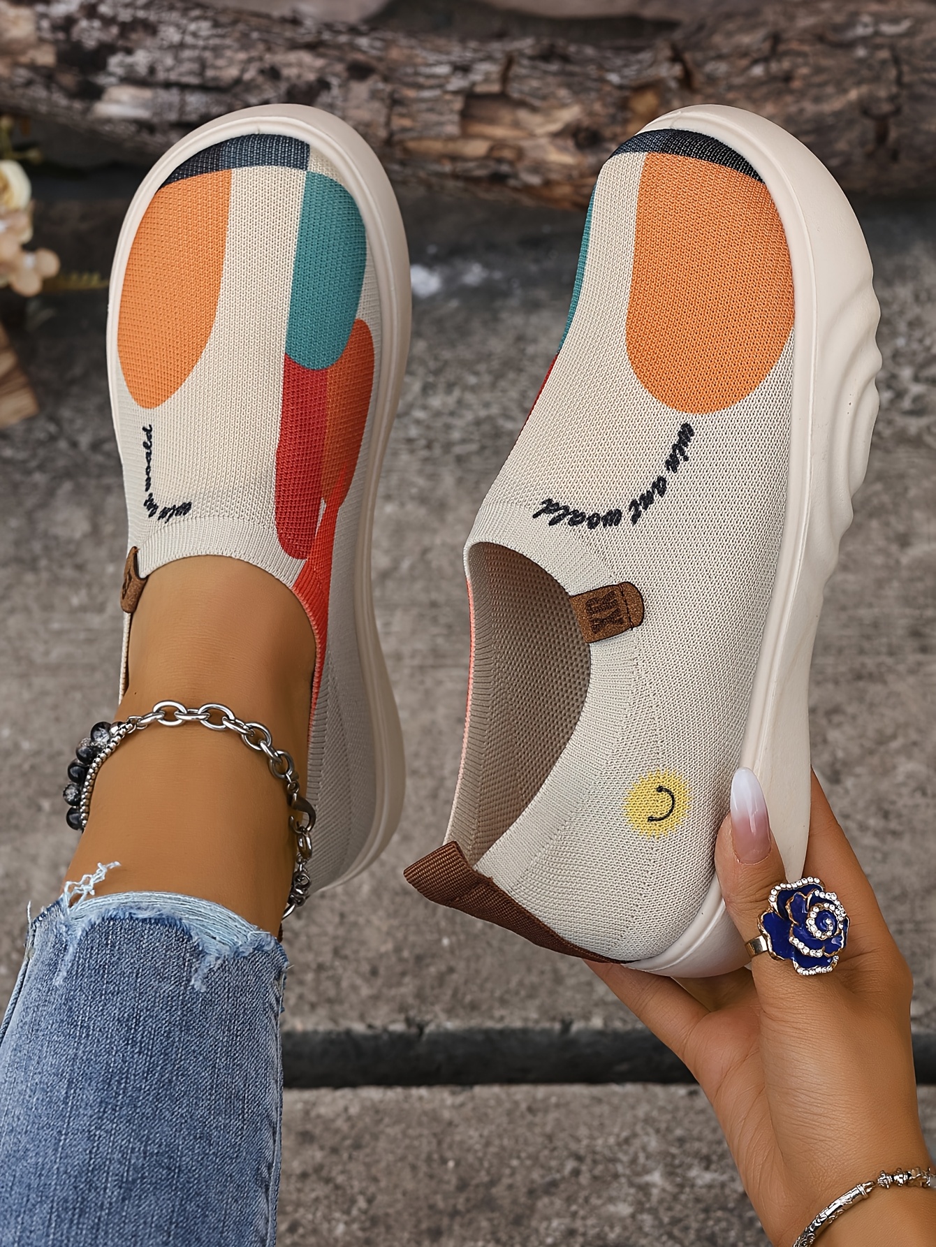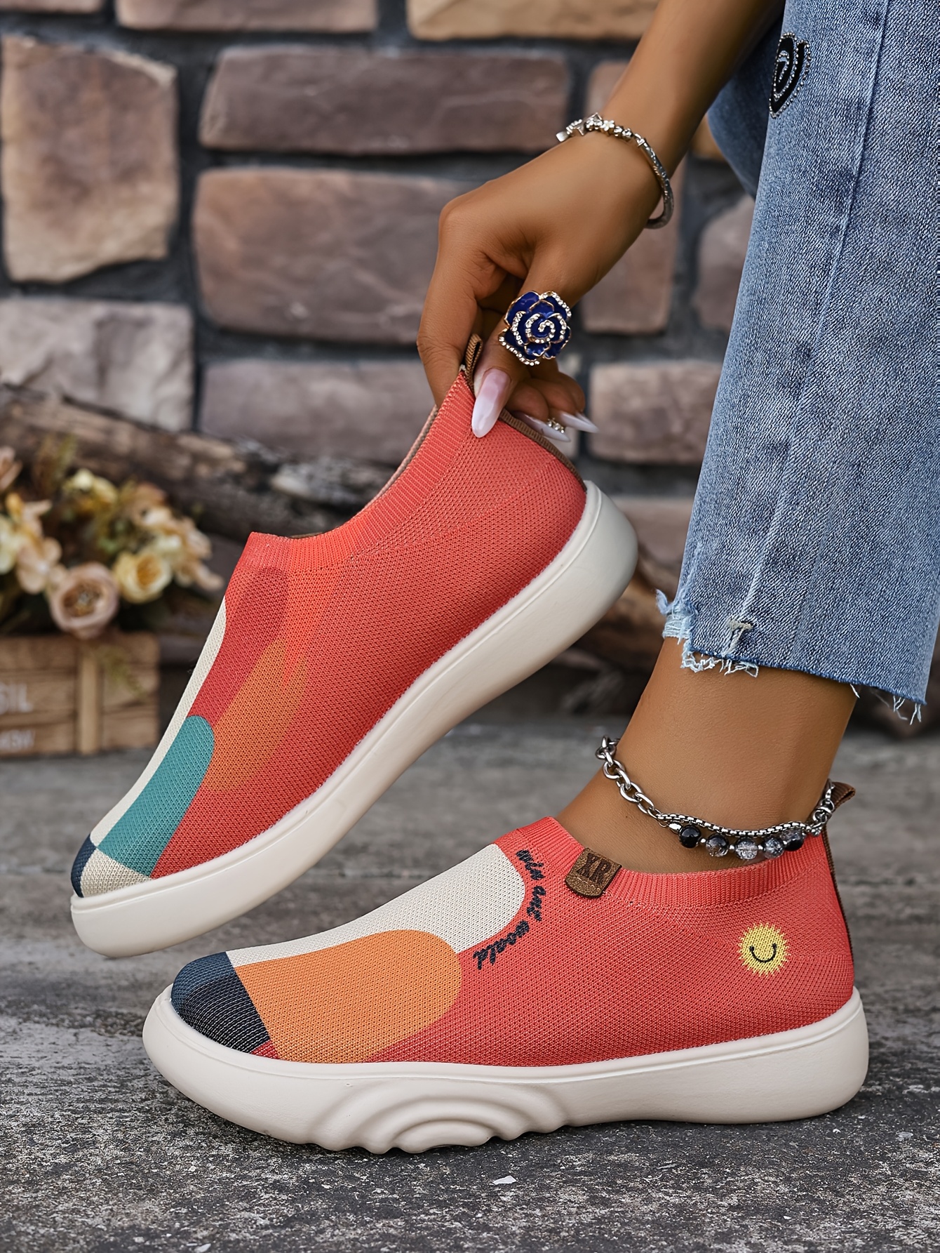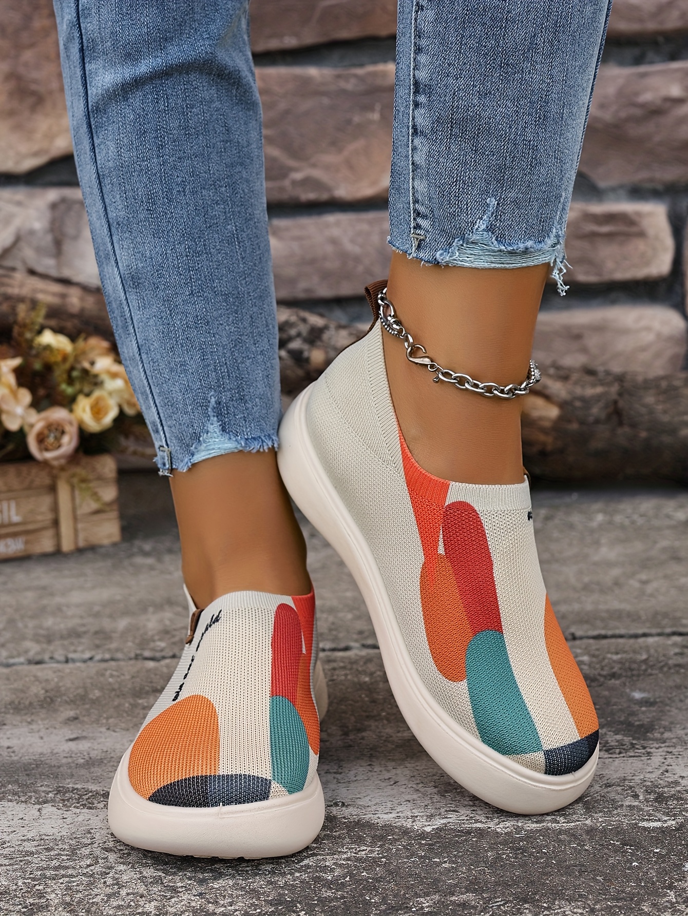 Tênis Femininos Slip-on Com Salto Bloco Colorido - Cabedal Em Tecido Macio, Sola de PVC Confortável, Design Casual de Bico Redondo para Primavera e Outono, Sapatos Fofos.