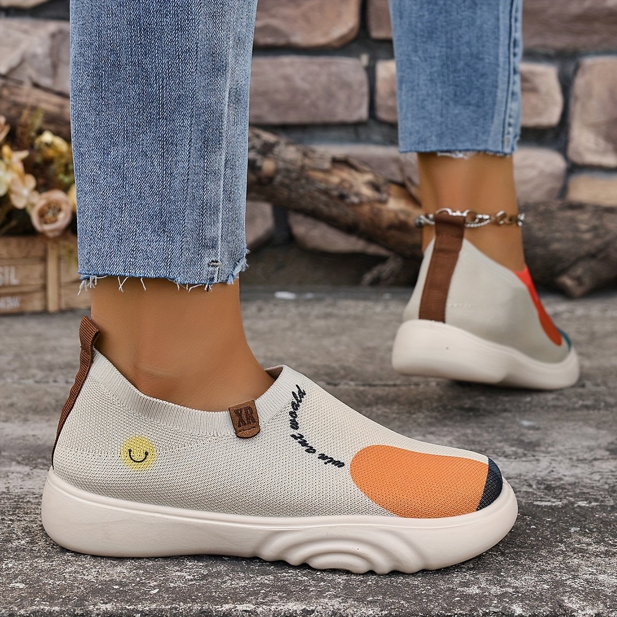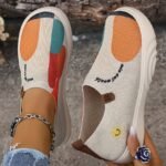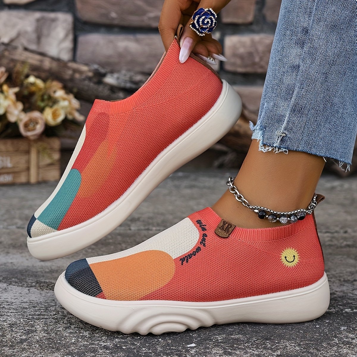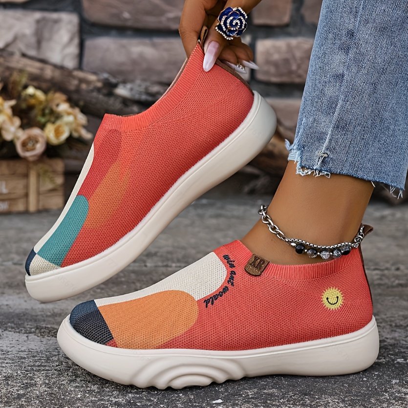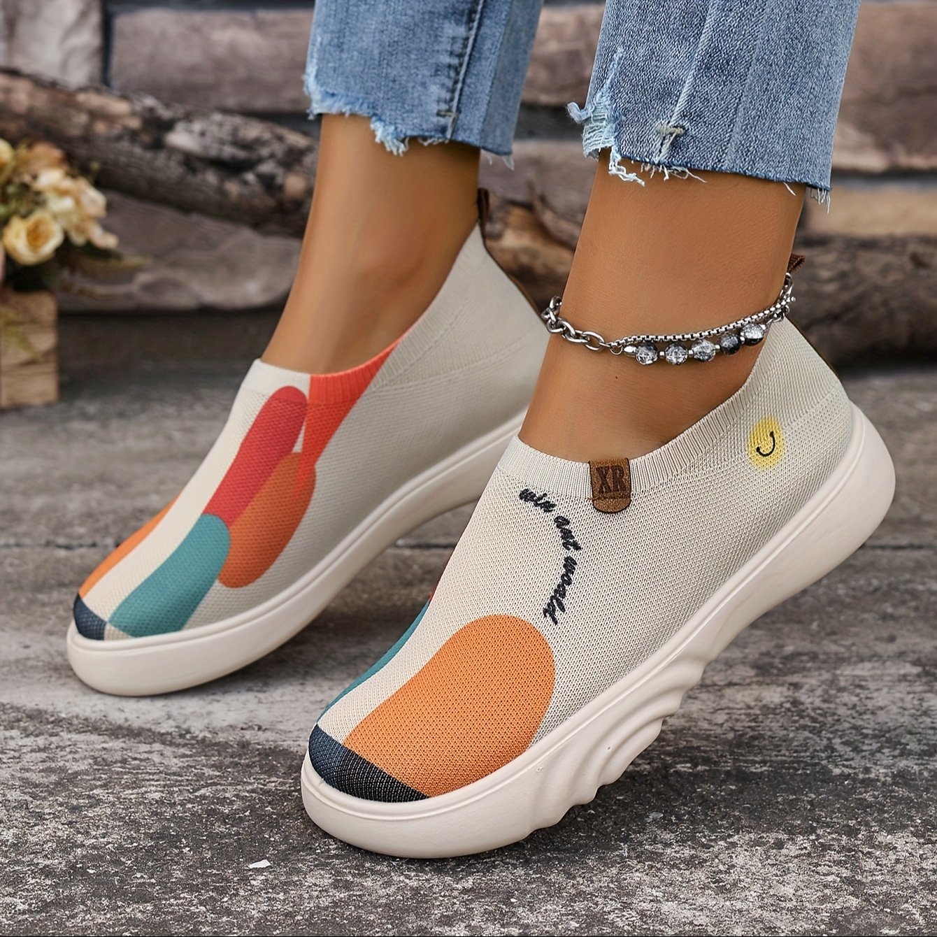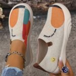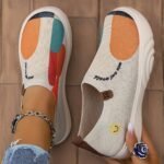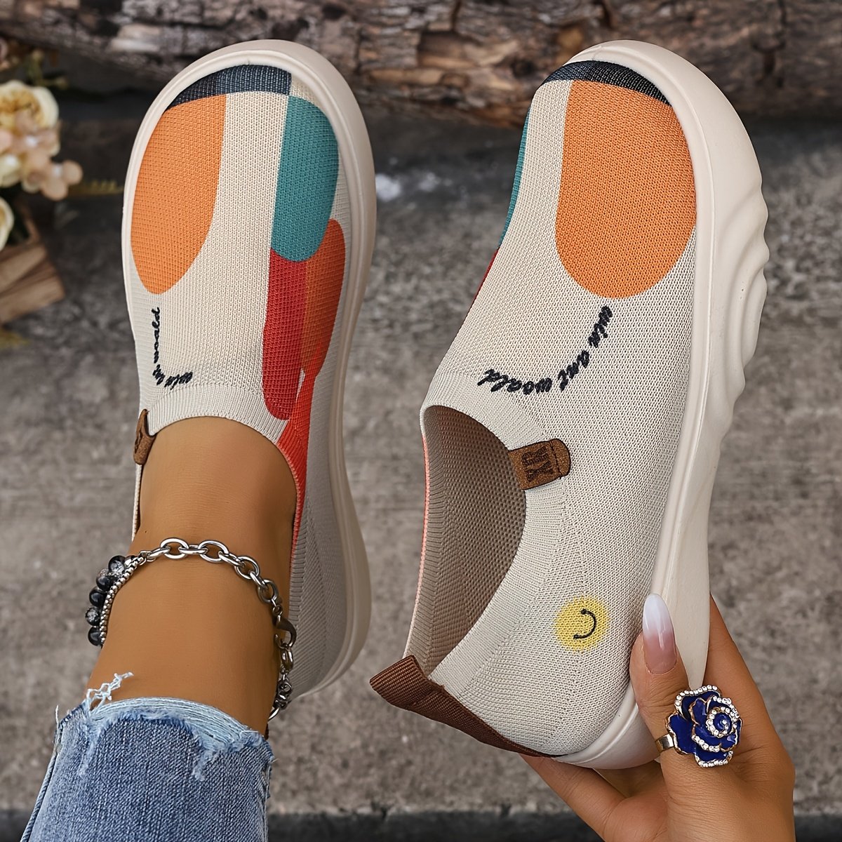 Tênis Femininos Slip-on Com Salto Bloco Colorido - Cabedal Em Tecido Macio, Sola de PVC Confortável, Design Casual de Bico Redondo para Primavera e Outono, Sapatos Fofos.