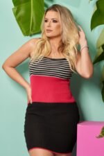 Vestido curto, confeccionada em tricot, de alça, decote U, tecido macio e confortável. Possui listras na parte superior. Sem bojo.